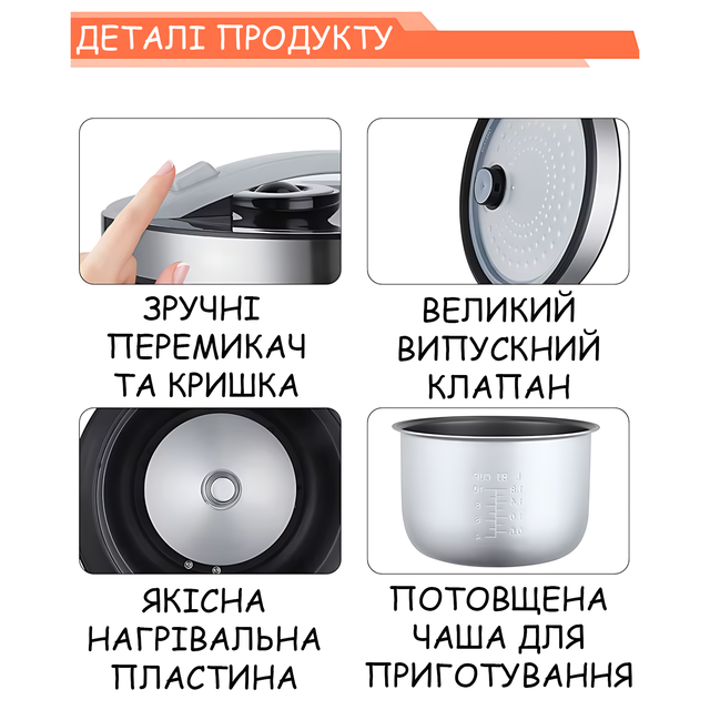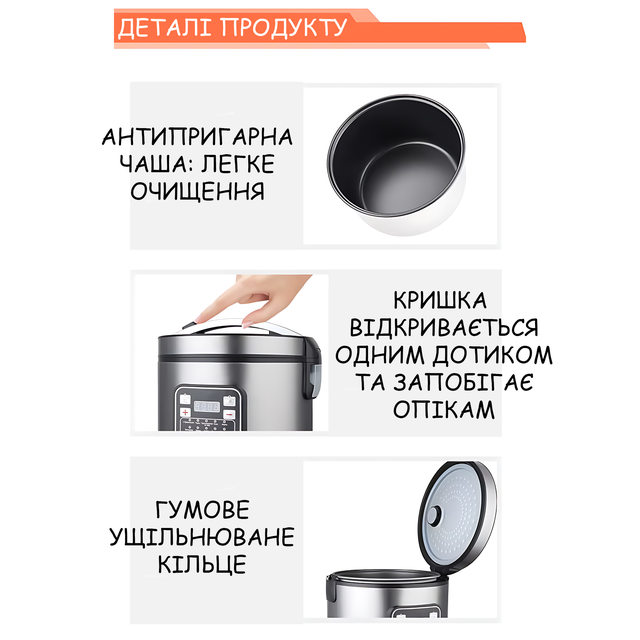 Є таймер відтермінування старту, режим підтримки температури та функція резервування — страва залишається теплою до подавання.