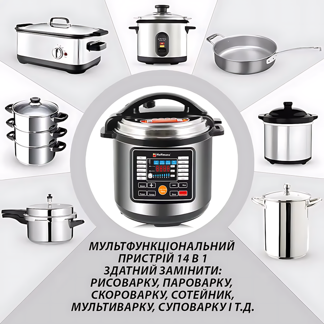 Мультиварка-скороварка Hoffmans HM-720, 12 л, 2000 Вт, 14 програм, антипригарна чаша, сенсорне керування, підтримка тепла, відкладений старт, дисплей