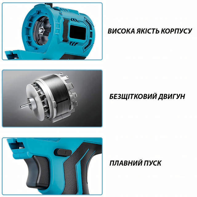- Ефективність: Безщіткові мотори забезпечують високу продуктивність і тривалий термін експлуатації інструментів.