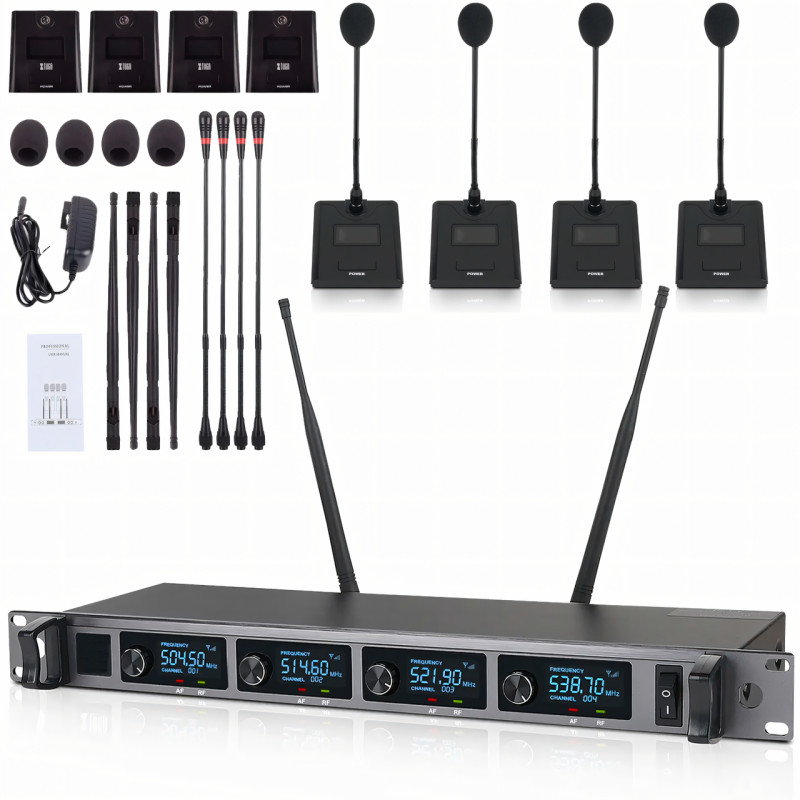 - Чотири бездротові мікрофони: У комплекті постачається чотири чорних бездротових мікрофони, що дає змогу використовувати їх для роботи декількох спікерів або для створення інтерактивної бесіди на заході;