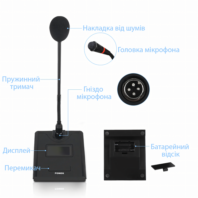 - Тривалий час роботи: Кожен мікрофон працює на батарейках, забезпечуючи до декількох годин безперервної роботи без потреби підзаряджання;