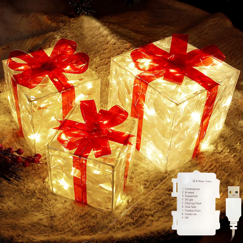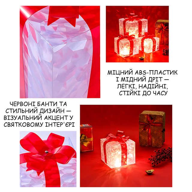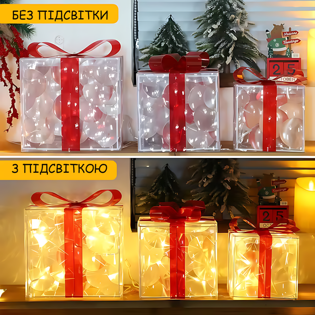 Три сяйних коробки-подарунки різних розмірів (15, 20 і 25 см) наповнюють простір теплом, затишком + святковою магією.