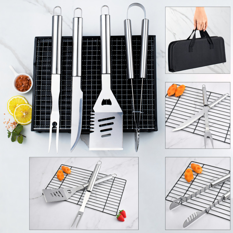 Практичний комплект для гриля та барбекю стане незамінним помічником для всіх поціновувачів пікніків на свіжому повітрі. До того ж невеликий, але ефективний набір інструментів для смаження овочів і м'яса на вогні: щипці, лопатка, ніж, виделка, все акуратно упаковано в сумку-чохол класичного чорного кольору зі змійкою та зручними ручками.