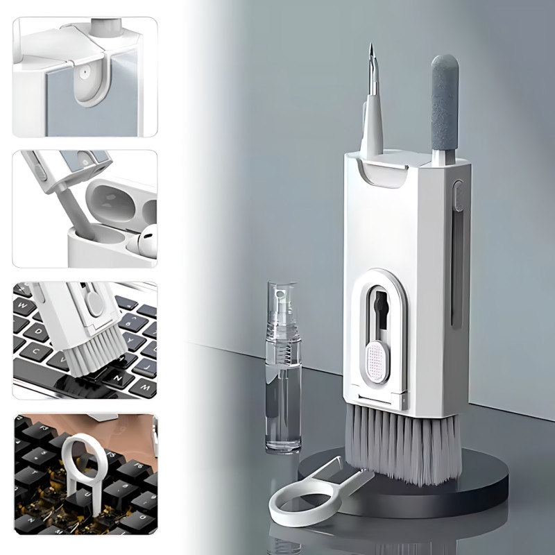 Набір для чищення 8-в-1 Cleaning Brush AND869 — це той самий міні герой у великій справі. Він як швейцарський ніж. Тільки замість лез — щіточки, розпилювач, скребок і...навіть підставка для смартфона. Все, щоб твій ноутбук, телефон і навушники сяяли та тішили око (і вуха!).