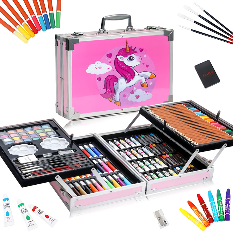 Це не просто "набір для малювання", це творча станція у валізі. І не в якомусь нудному, а в рожевому, блискучому, з єдинорогом! Тут 145 штук корисностей: фломастери, олівці, пастель, фарби — бери та малюй хоч захід над морем, хоч космічного кота 🐱🌌.