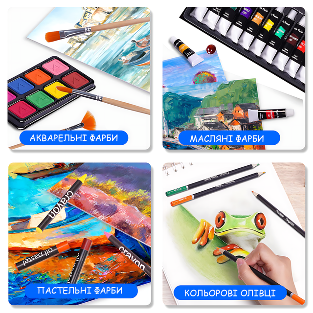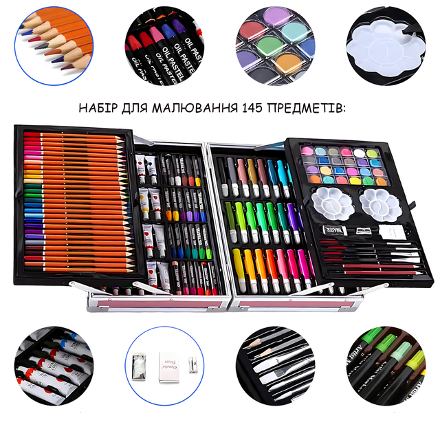 - 🎁 145 предметів — пензлі, фломастери, фарби, олівці та навіть стругачка з гумками