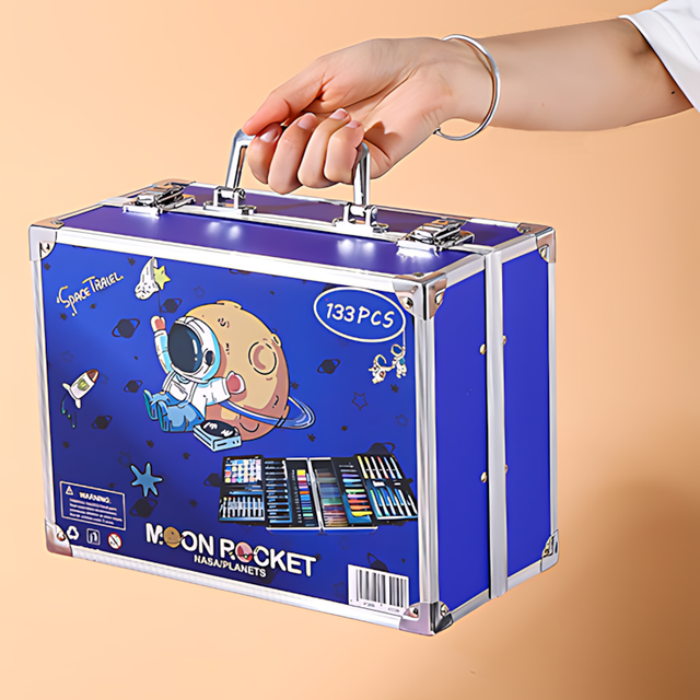 Набір для творчості в складаній валізі, прикрашеній космічними мотивами. Це ідеальний подарунок для будь-якого маленького творця, який відкриє світ уяви та креативності! Набір містить до 133 різних елементів, які дадуть змогу дитині спробувати різні техніки малювання. У комплекті ви знайдете акрилові маркери, двобічні маркери, що поєднують тонкий і товстий кінчик, що дає змогу малювати як точні деталі, так і великі поверхні.