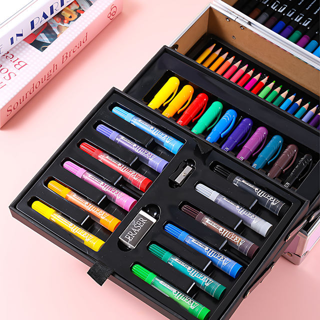 - Різноманітність матеріалів: Від кольорових олівців і маркерів до олійних пастелей і акварелей — цей набір надає широкий вибір художніх інструментів для дослідження різних стилів і технік;