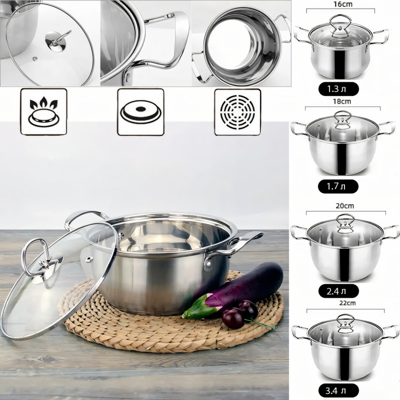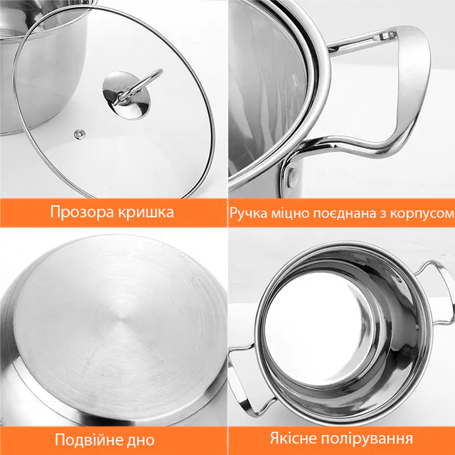- Неіржавка сталь високої якості: Матеріал із неіржавкої сталі забезпечує довговічність і стійкість до корозії, роблячи каструлі надійними та міцними;