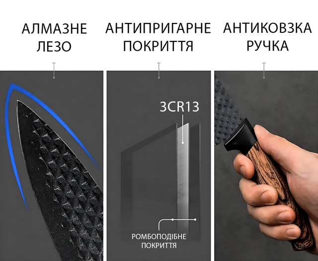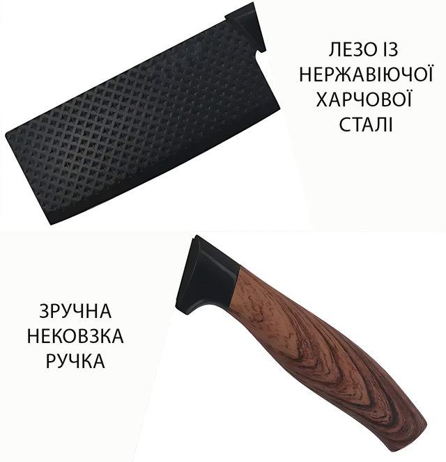 Ручки — окреме задоволення: ергономічні, нековзні, з покриттям Soft-Touch, стилізовані під дерево. Ніж зручно лежить у руці, не вислизає навіть за вологих долонь і не стомлює кисть під час тривалої роботи.