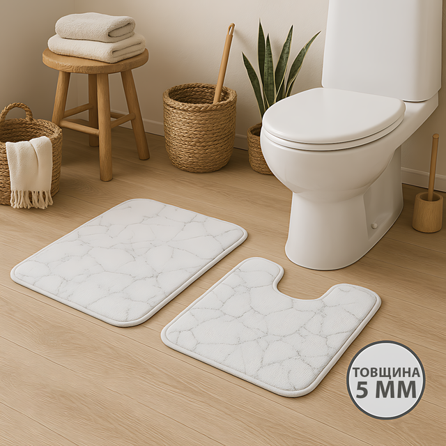 - ✨ Грамотно підібраний комплект — один килимок із вирізом під унітаз, другий — універсальний