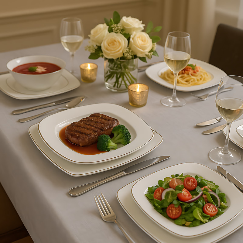 Елегантний, універсальний і міцний — саме так можна описати набір посуду Leebull MKS-523. У ньому 26 предметів: від глибоких супових тарілок до десертних чаш. Білосніжна поверхня з тонкою золотистою облямівкою надає сервіруванню благородного вигляду. А сучасний квадратний дизайн робить подавання стильним.