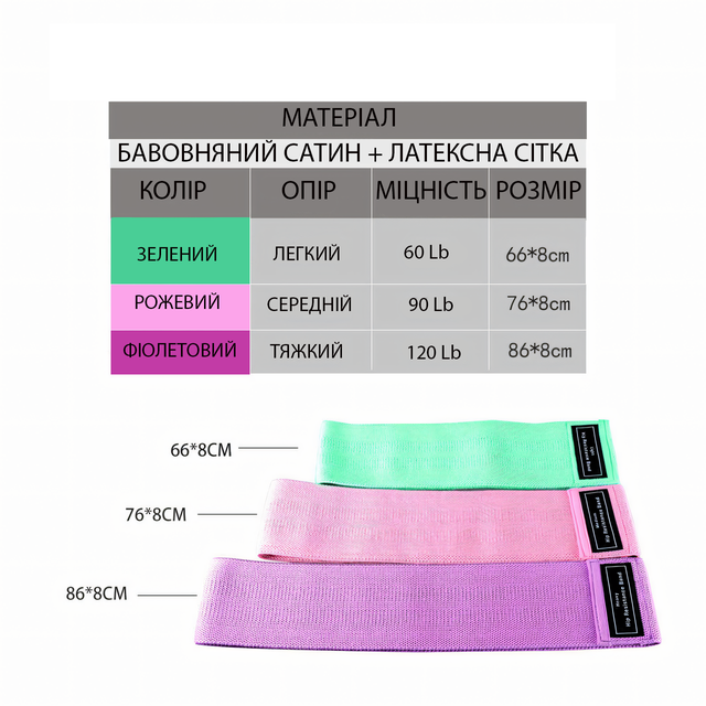 - Стильний дизайн: Кольорові та з яскравим принтом, ці гумки додають різноманітності та стилю до ваших тренувань, роблячи їх захопливішими та мотивувальнішими.