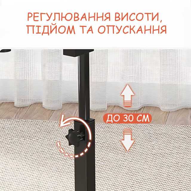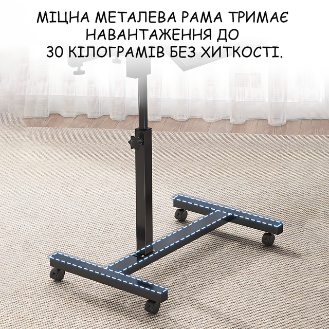 Висота регулюється в діапазоні 60-90 см, тому стіл однаково зручний сидячи та напівсидячи. І лежачи. Міцна металева рама тримає навантаження до 30 кілограмів (без хиткості). А якісне ДСП із товщиною 15 мм має акуратний вигляд.