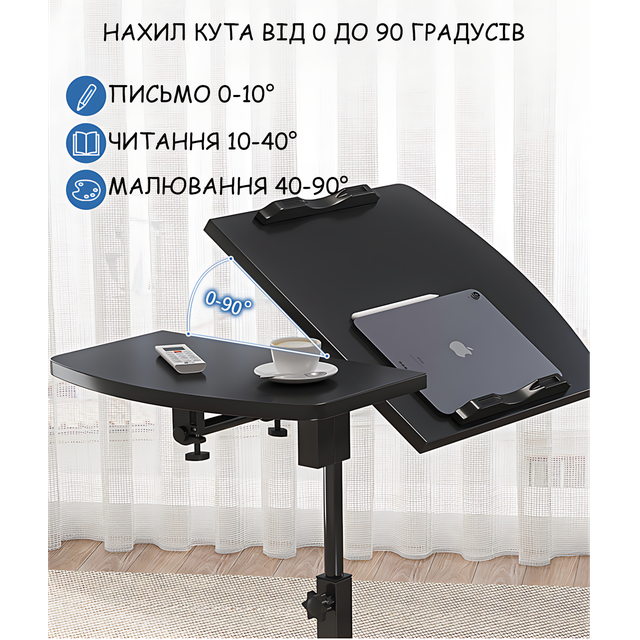 Наддиванний стіл на коліщатках із подвійною стільницею, регульованою висотою 60-90 см і кутом нахилу до 90°, 60×20 см, металева рама, ДСП, 4 колеса з фіксацією, чорний