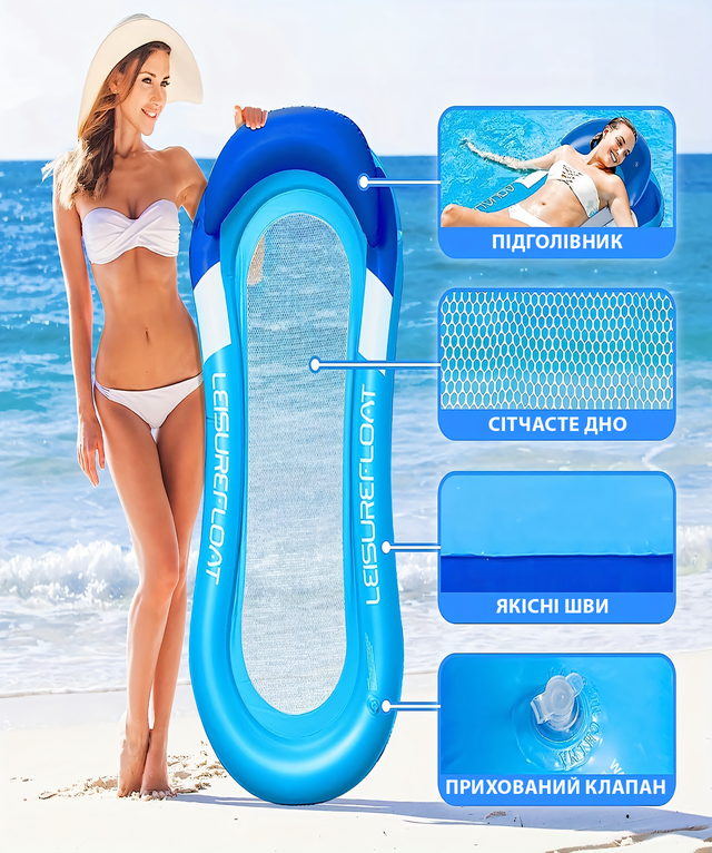 - Легко надувається і здувається: Надувний матрац-шезлонг обладнаний зручними клапанами, які дають змогу швидко та легко надути його за допомогою насоса або навіть вручну. Також його можна швидко здути, що робить його ідеальним для використання на пляжі або в басейні, коли час на складання обмежений;