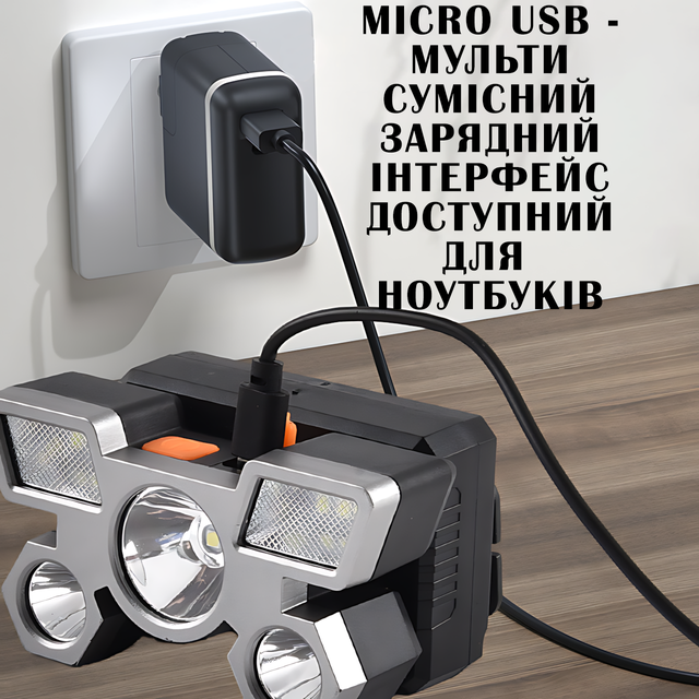 Налобний ліхтар HEAD LIGHT з 5 яскравими світлодіодами та вбудованим акумулятором 18650