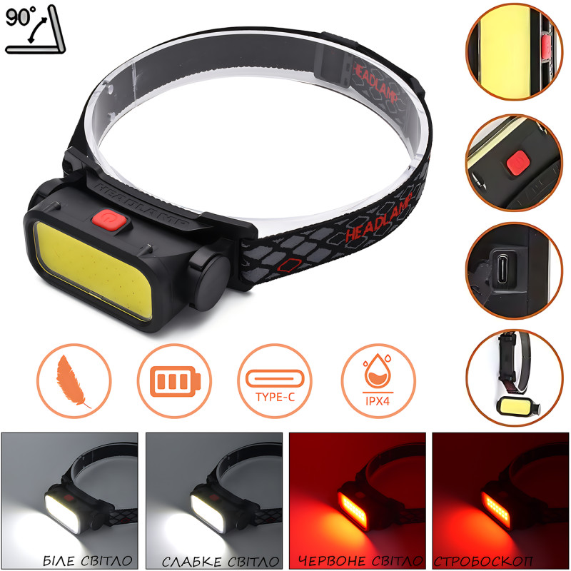 Налобний ліхтарик із червоним світлом COB BL 008 з батареєю 1200 мА·год, з 4 режимами світіння й type-C