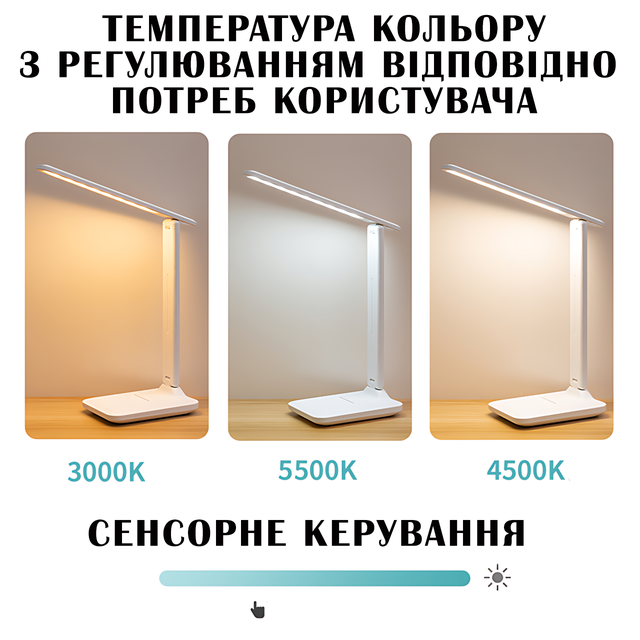 Потребали лампу злегка, без зусиль — і вона відразу вмикається. Сенсорний вимикач — просто мрія для лінивців. Тільки торкнулися — і ось він знову горить світло! І ще: три різні відтінки світіння або яскравості, називайте як зручніше. Вранці м'який, теплий, наприклад 3000K, ввечері холодніший 5500K — щоб очі не втомлювалися й не бадьорити себе перед сном. Все продумано для користувача!