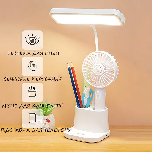Настільна лампа К868 з підставкою для мобільного, канцелярії, з 3 режимами світла, USB-зарядкою