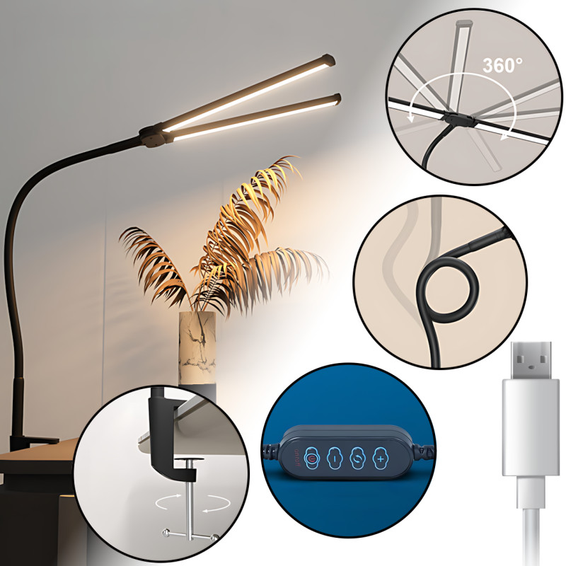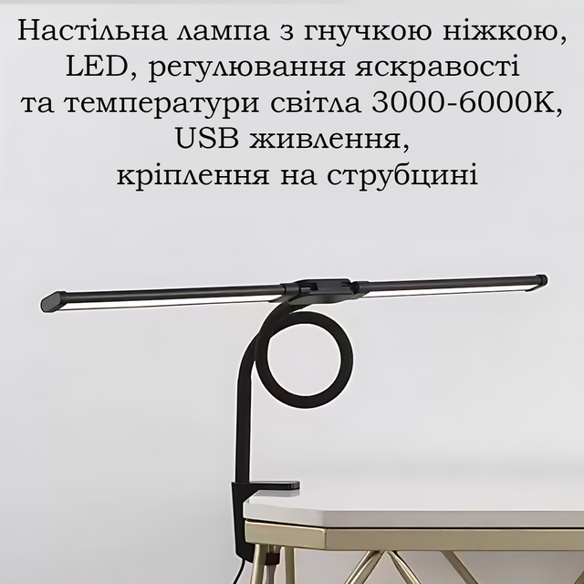 Настільна лампа MA729 з гнучкою ніжкою, LED 10 Вт, регулювання яскравості та температури світла 3000-6000K, USB живлення, кріплення на струбцині, чорна