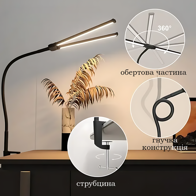 - Конструкція: Гнучка ніжка («гусяча шия»);