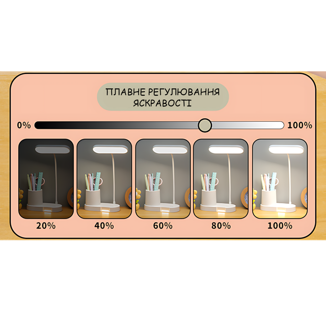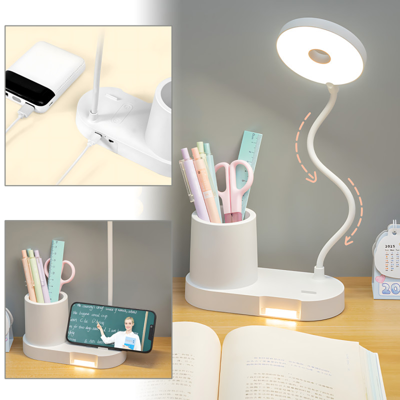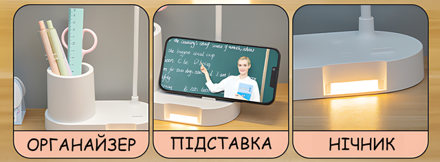 Вбудований акб 1200 мА·год дає до 4 годин автономної роботи, тож лампа під час вимкнення світла продовжує робити свою справу. А основа з органайзером XL і підставкою для телефона акуратно збирає хаос зі столу. Ручки не розбігаються, смартфон не губиться.