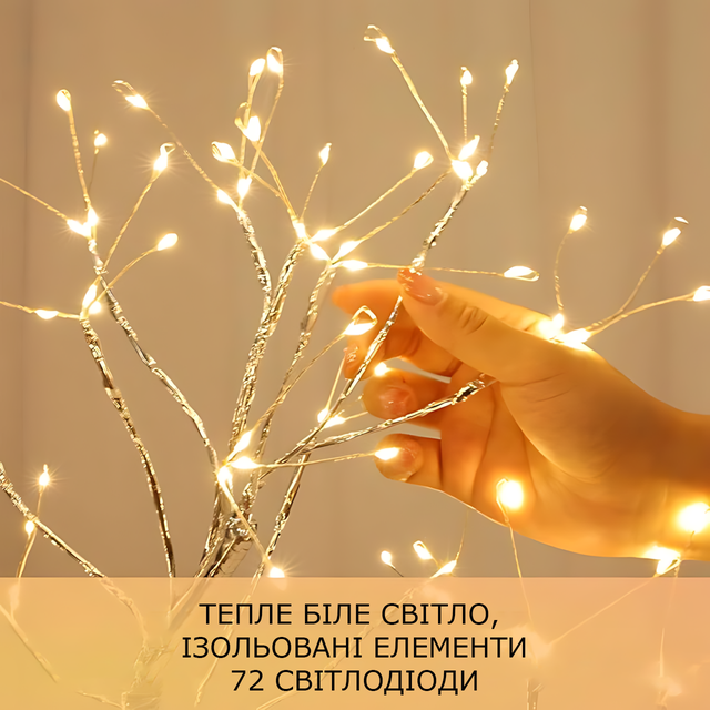 - 72 LED-лампочки — яскраве, рівне, тепле світло.