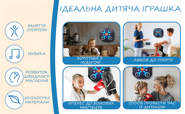 Як зацікавити дитину фізичною активністю? Спробуйте придбати настінний боксерський тренажер, який зробить тренування не тільки корисними, але й цікавими! Цей тренажер — інноваційне рішення, що поєднує фітнес і розвагу. Тепер заняття боксом — це не просто удари по груші, а захопливе тренування в ритмі музики з ефектною підсвіткою!