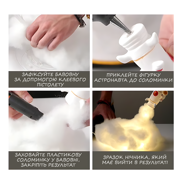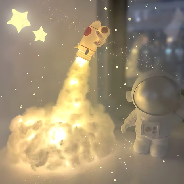 - Простота збирання й увімкнення: До комплекту входять усі необхідні матеріали для збирання, включно з клейовими стикерами та фігуркою астронавта. Процес складання інтуїтивно зрозумілий і не вимагає особливих інструментів, а вбудований USB-порт дає змогу під'єднати пристрій до будь-якого стандартного джерела живлення.