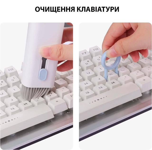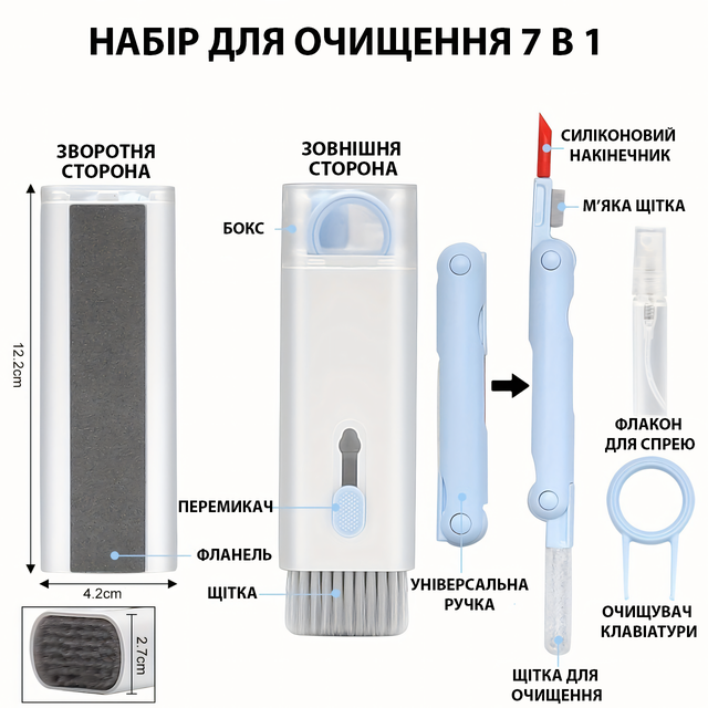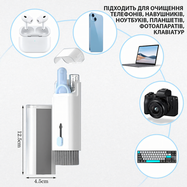 Комплект інструментів для чищення 7 в 1 являє собою універсальне рішення для підтримання чистоти й порядку у вашому електронному житті. Він призначений для ефективного очищення різних пристроїв, включно з навушниками, клавіатурами, мобільними телефонами, камерами, комп'ютерами та планшетами.