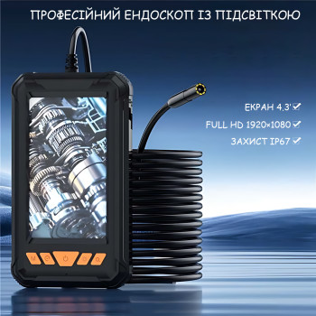 Професійний ендоскоп P380 з екраном 4.3'', Full HD 1080P, камера 8 мм, кабель 5 м, 8 LED-підсвітка, ..