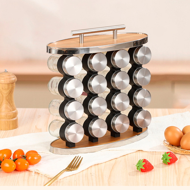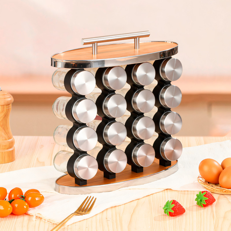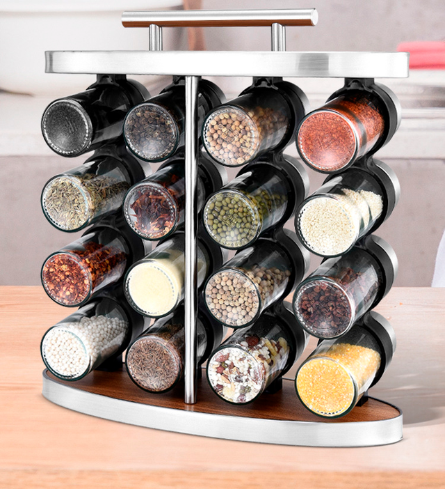 - Економія місця: всі 16 відсіків для спецій зберігаються на зручній підставці, що економить місце на кухні.