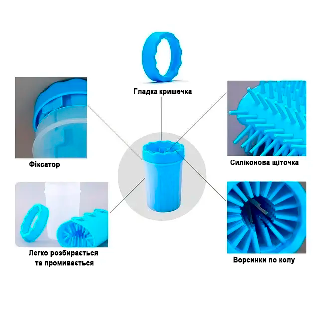 Лапомийка — це ідеальне рішення для чистки лап після прогулянок, що складається з пластикового стакану та силіконової щітки. Пристрій легко справляється з брудом, який залишається на лапах собак після активних прогулянок, подорожей і відпочинку на природі. М’які силіконові щетинки ніжно та ефективно видаляють забруднення, такі як пісок і глина, навіть у важкодоступних місцях між пальцями та подушечками лап, тому весь бруд залишається всередині стакану, а не на підлозі вашого дому. Зовнішня поверхня лапомийки має рельєфні виступи, завдяки чому пристрій зручно тримати в руці, навіть якщо вона волога. Пристрій зручний і простий у використанні, легко розбирається і чиститься.