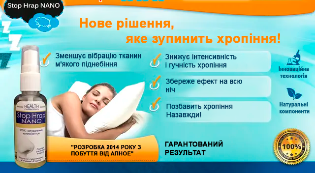 Спрей від хропіння Stop Hrap Nano є найбільш прогресивним і перевіреним методом лікування хропіння, який назавжди позбавляє недуги. Даний засіб є запатентованим, при цьому відрізняється безпекою та легкістю у застосуванні. До основних переваг засобу можна віднести те, що воно приносить стабільний, а також виражений ефект. Стоп Хропіння є унікальним напрацюванням американців.