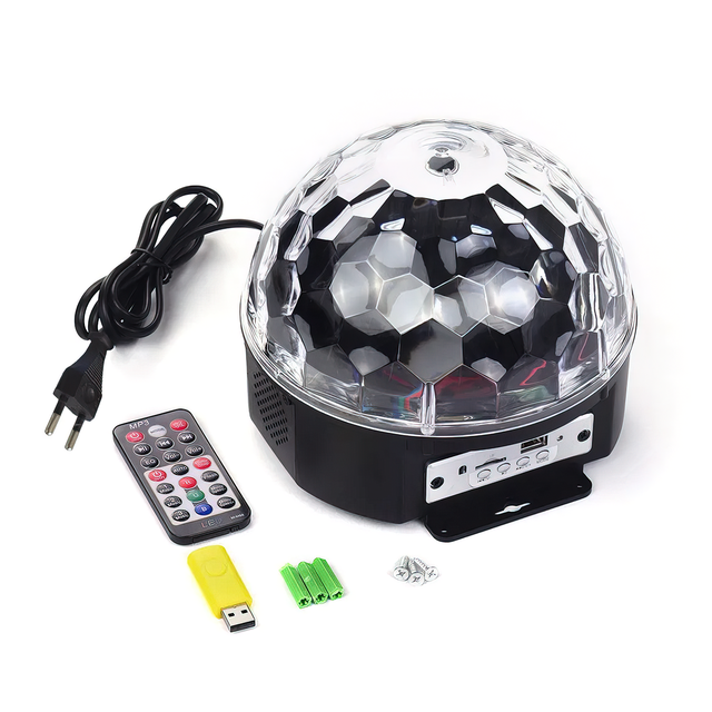 Диско-шар Magic Ball Light з плеєром — ідеальний засіб для надання яскравості вашим вечіркам. Цей компактний прилад перетворить будь-яку подію на захопливе шоу кольорів і музики. Світлодіоди, змінюючи кольори та створюючи різноманітні ефекти, наповнять приміщення святковою атмосферою. Вбудовані динаміки та можливість відтворення музики у форматі MP3 через USB або SD роблять його невіддільним атрибутом вечірок.