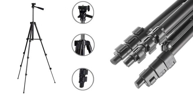 Висота штатива регулюється, так що ви завжди зможете вибрати максимально зручне положення для зйомки. Наконечники ніжок прогумовані, тому штатив не ковзає і стійко стоїть на будь-якій поверхні.