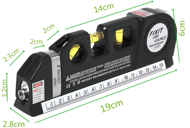 Лазерний промінь у рівні дозволяє продовжити профіль рівня у просторі, для зручності є вбудована рулетка завдовжки 2.5 м. Опорна платформа дозволяє виконана з алюмінію допоможе надійно та точно встановити інструмент на рівну поверхню без застосування триноги. Лазерний рівень Laser Level Pro 3 ― це універсальний міні рівень, який відрізняється зручністю та легкістю в роботі. Це легкий рівень, за допомогою якого ви можете проводити кутові вимірювання, такі як ухил схилу даху та кут зрізу і т.д.
