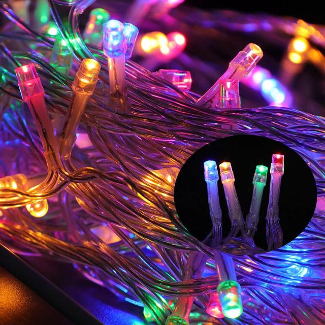 Різнокольорова світлодіодна гірлянда 100 LED 10 метрів XMAS, прозорий провід, підключення 220 В