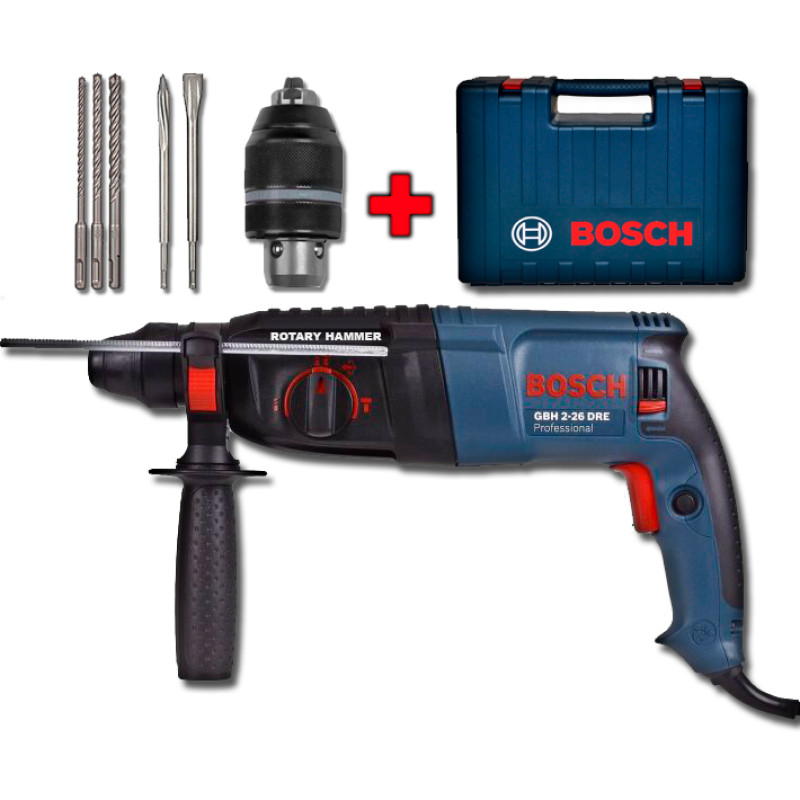 Перфоратор Bosch GBH 2-26 DFR - надійний інструмент професійного класу, від всесвітньо відомого бренду Бош, що застосовується у будівництві та ремонті. Призначений для виготовлення отворів у різних твердих матеріалах: камені, цегли, бетоні. У режимі довбання перфоратор Bosch GBH 2-26 DFR використовується для демонтажу плитки, штукатурки, штроб. Значно розширює сферу застосування інструменту режим свердління, завдяки якому поставивши швидкозмінний кулачковий патрон (іде в комплекті) можна свердлити метал, пластик, дерево. Перфоратор має потужний електромотор – 800Вт, що дає можливість працювати з найтвердішими матеріалами. Завдяки наявності функції реверсу, є можливість вивільнити свердло, що застрягло.