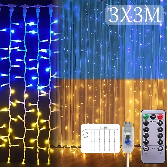 Гірлянда «Штора» з ефектним світінням у кольорах прапора України — стильна прикраса для вашого інтер'єру. Розмір 3х3 метри дає змогу використовувати її для декору стін, вікон або створення яскравих акцентів у будь-якому приміщенні. Оснащена пультом дистанційного керування та під'єднанням через USB, вона забезпечує зручність у використанні та різноманітність світлових режимів, створюючи атмосферу затишку та свята цілий рік.