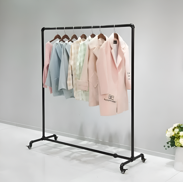 Clothes Rack Black — це елегантне та практичне рішення для зручного зберігання й організації вашого одягу. Ця підлогова стійка виготовлена з металу, пофарбованого в чорний колір, і обладнана одним рівнем для розміщення різноманітних предметів одягу. Ідеально підходить для використання в гардеробних, спальнях, передпокоїх або навіть магазинах завдяки своїй міцній та стійкій конструкції, спроможній витримувати чималу вагу одягу.