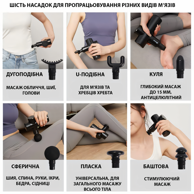 - Висока ефективність: Завдяки різноманітним насадкам і 30 рівням швидкості, цей масажер забезпечує індивідуальний і ефективний масаж для різних груп м'язів;