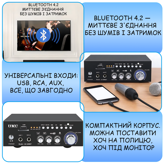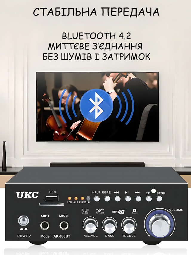 - Підсилювач звуку AMP 688 BT 2CH;