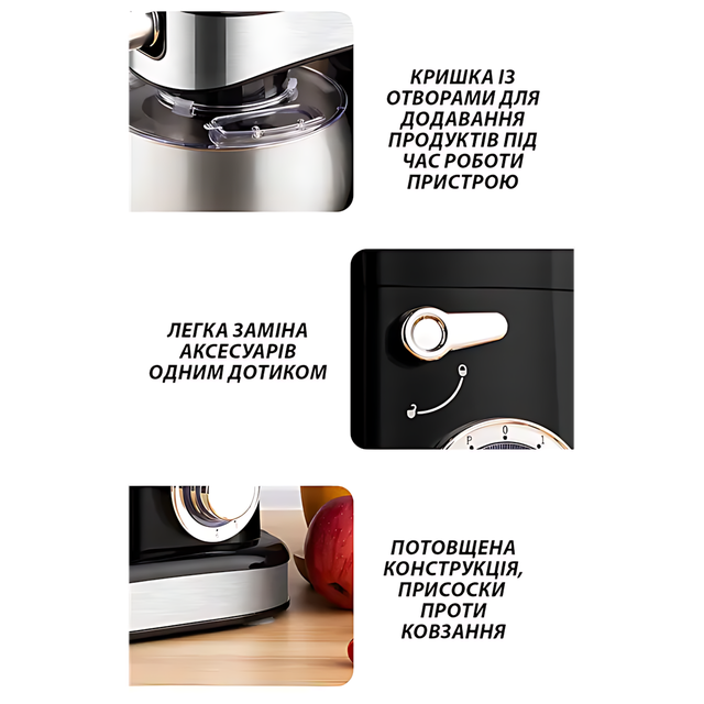 Дизайн? Чорно-сріблястий. Стильний. Солідний. Стоїть на кухні, як професіонал на своєму посту. Протиковзні ніжки тримають його в тонусі. Навіть на максимальній швидкості. А в комплекті — все, що потрібно! Віночок, гак для тіста та лопатка.