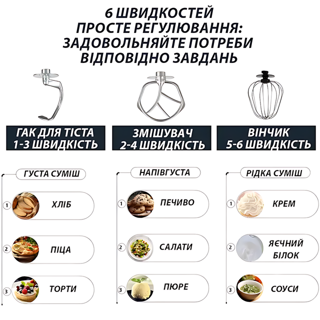 - 🎯 6 швидкостей + імпульс — під будь-який рецепт