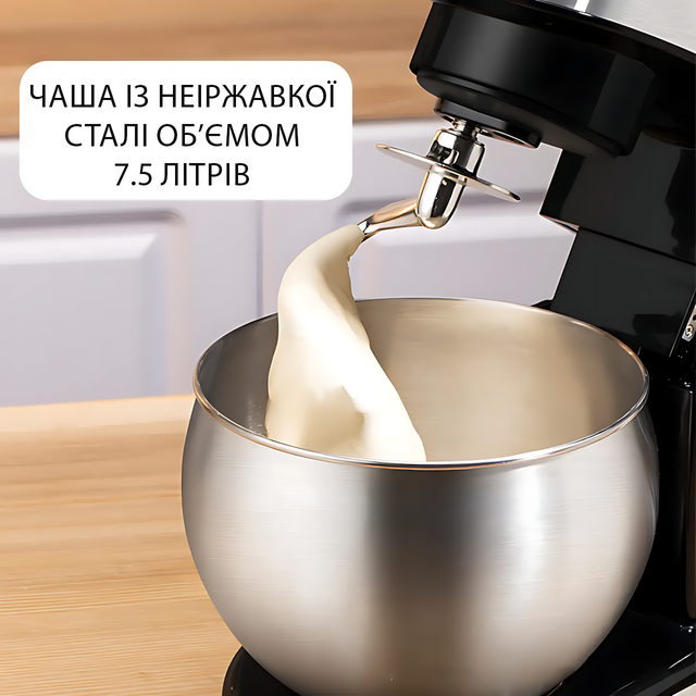 Потужний мотор 2000 Вт (номінальна 1300 Вт) — як турбіна = яка не знає слова «втомився». А величезна чаша на 7,5 л із неіржавкої сталі — цілий стадіон для ваших інгредієнтів. Хочете замісити тісто на кілька батонів хліба? Будь ласка. Збити крем для цілого торта? Легко.