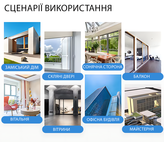 - Використаннядля вікон, вітрин, балконів, офісів, автомобілів.
