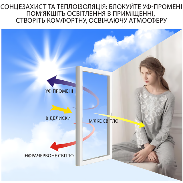 - ❄️ Знижує нагрівання скла і повітря в кімнаті;