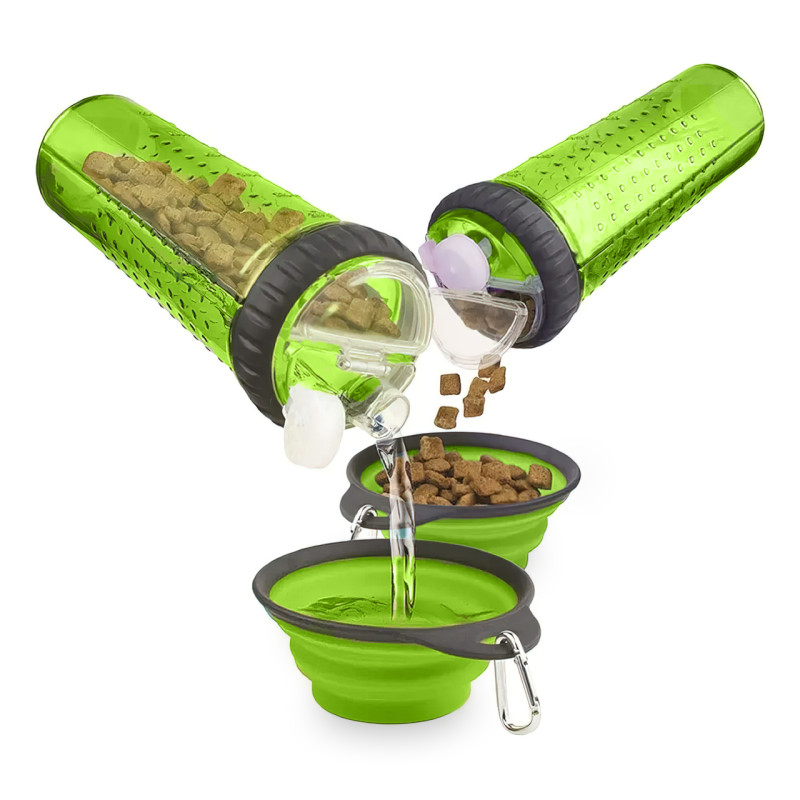 Подвійна пляшка Snack DuO надає вам зручну можливість взяти із собою в поїздку воду та корм (лакомництва) в одній компактній ємності. Усередині пляшки розташовані два відділення: одне призначене для рідини, а інше — для сухого корму або ласощів. Просто відкрийте прозору кришку та насипте корм або ласощі, потім відкрийте маленьку герметичну кришку та налийте воду. Додатково до подвійної пляшки, до комплекту входить складана миска з карабіном, яку можна легко прикріпити до пляшки. Ця компактна миска зручна для втамування спраги та годування вашого вихованця в будь-який час і в будь-якому місці. Беріть із собою Snack DuO і забезпечте своєму вихованцеві свіжу воду та смачний корм під час прогулянок або подорожей.